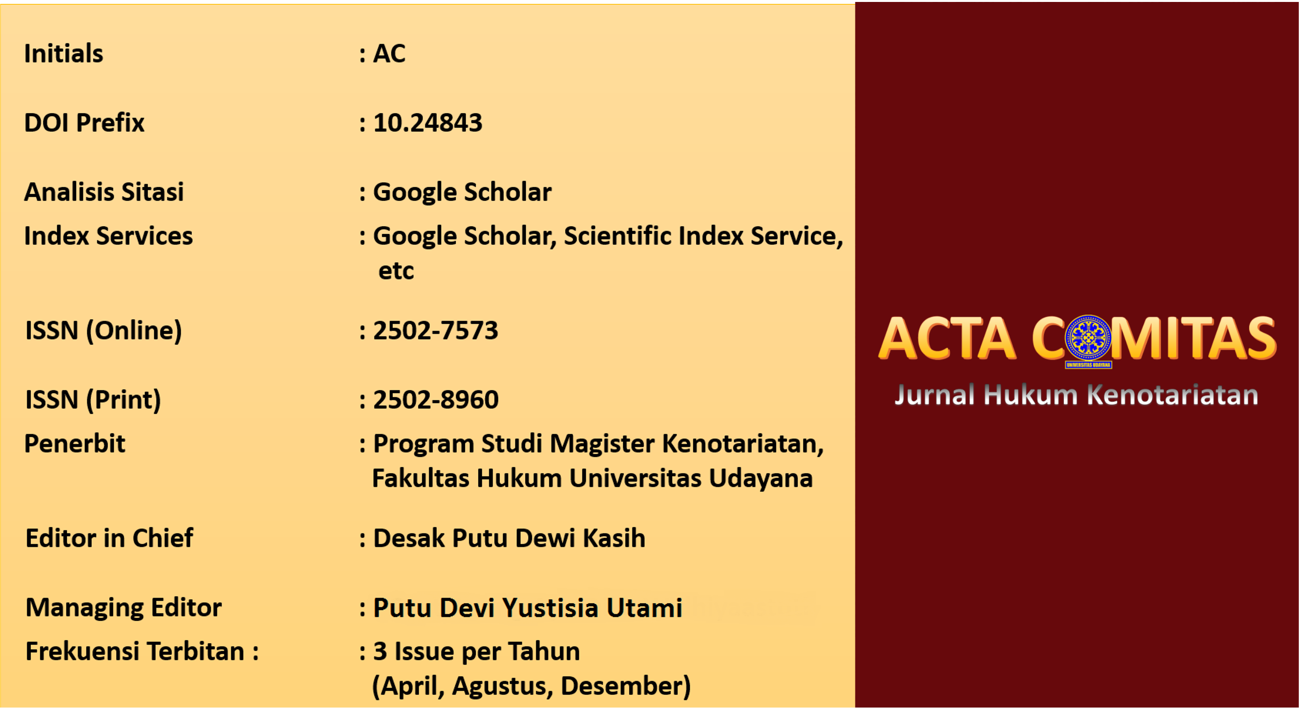 Kami informasikan bahwa situs web ini merupakan platform terbaru untuk Acta Comitas: Jurnal Hukum Kenotariatan, yang sebelumnya dikelola melalui alamat: https://ojs.unud.ac.id/index.php/actacomitas/